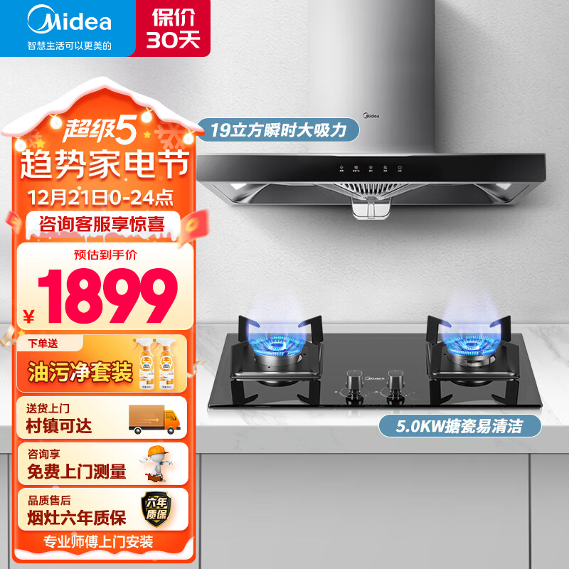 美的(Midea)烟灶套装 小尺寸欧式抽油烟机家用 5KW钢化玻璃双灶 油烟机燃气灶套装T33A+Q330液化气价格:1899.00元!