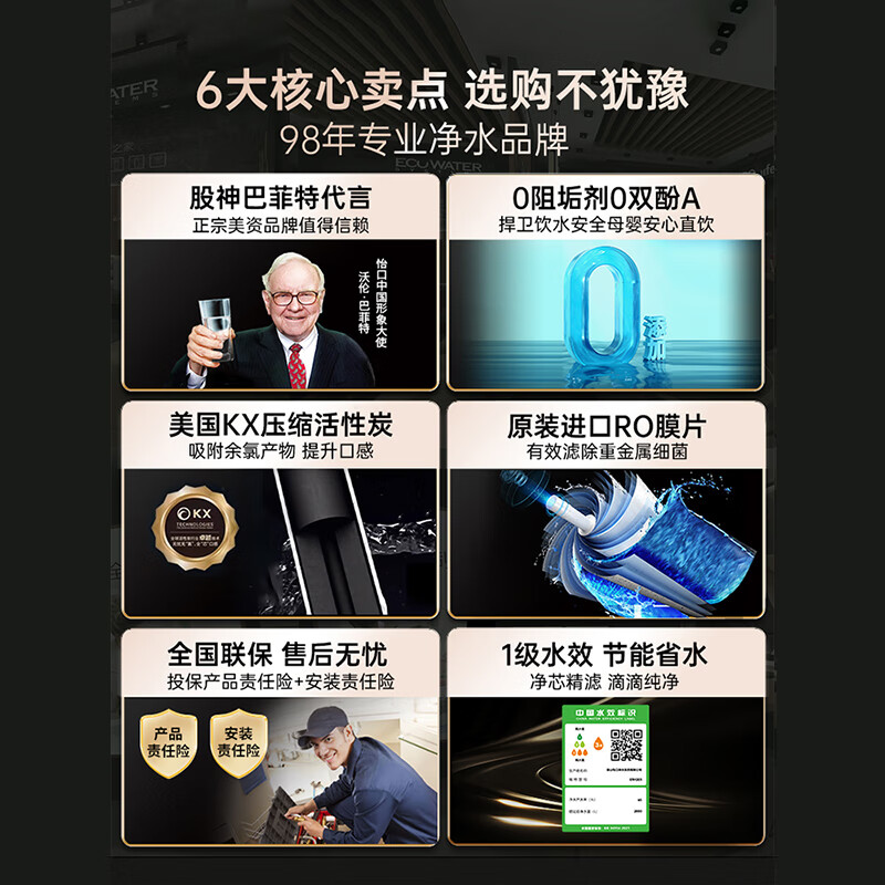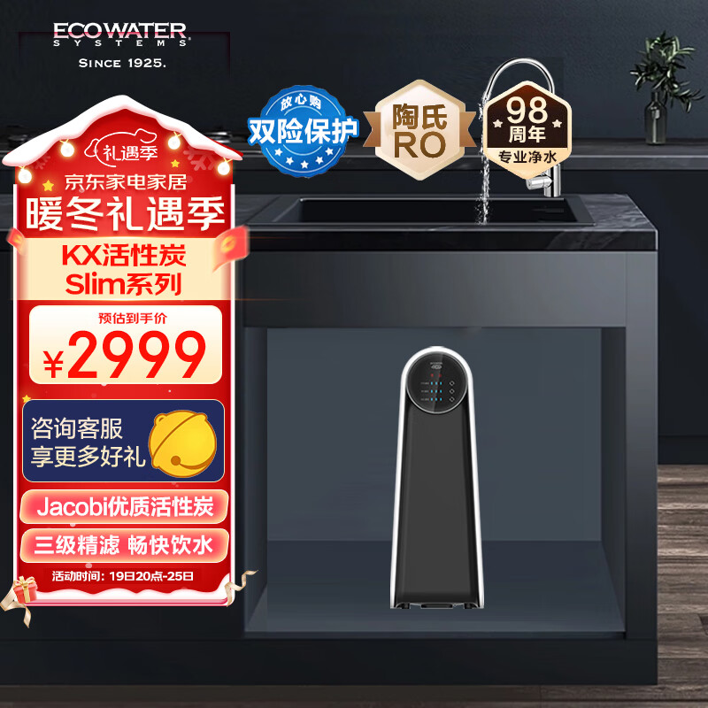 怡口净水(ECOWATER)净水器家用500G厨下直饮RO反渗透精滤KX压缩活性炭提升口感浅薄小巧节省空间1级水效ERO252-3价格:2999.00元!