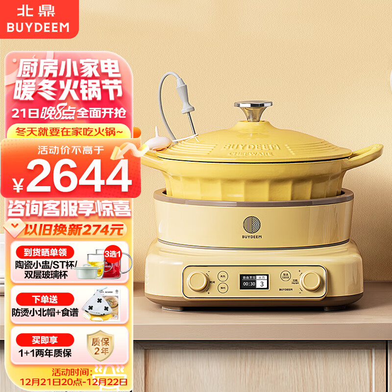 北鼎(Buydeem)电磁炉电陶炉套装多功能一体家用大功率火锅汤锅珐琅锅免火炒菜【小鹅黄CP】电磁炉+25cm焖炖锅价格:3044.00元!