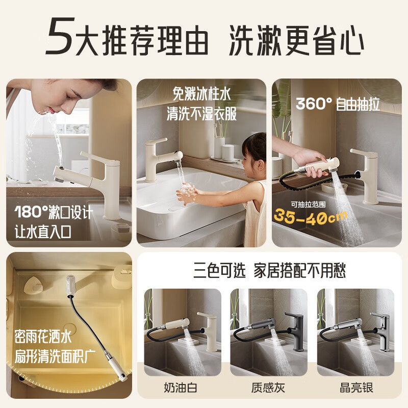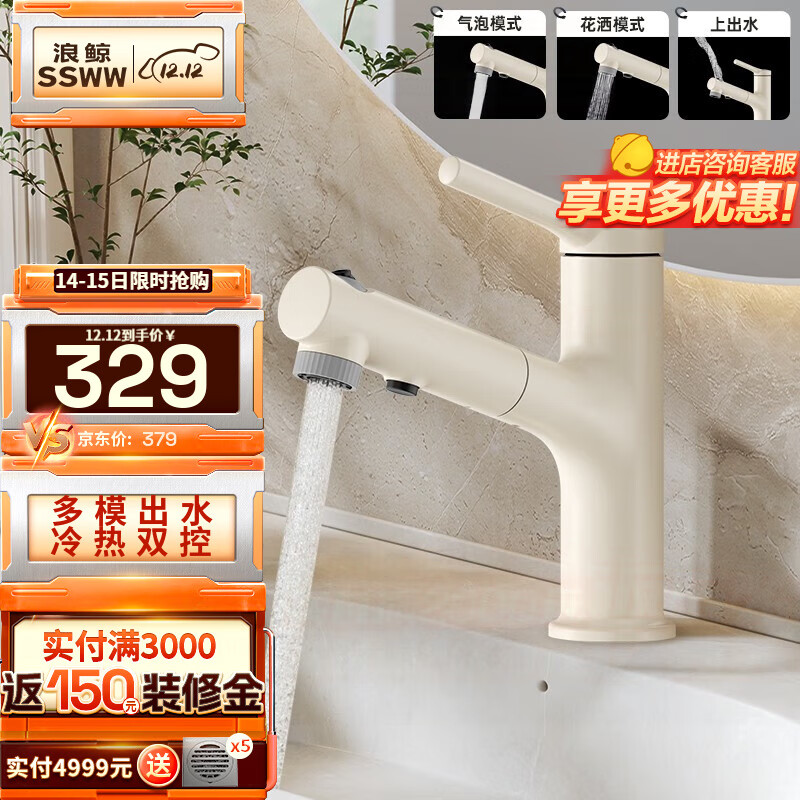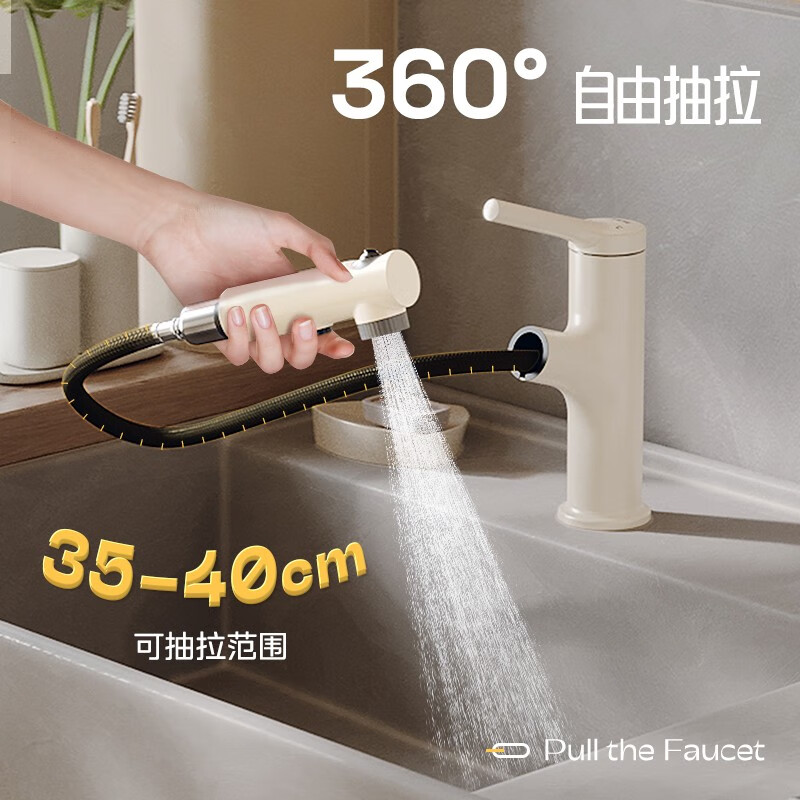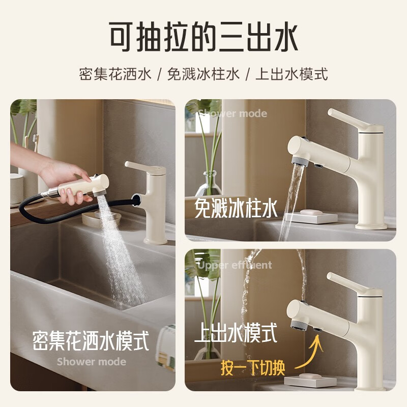 浪鲸(SSWW) 多功能抽拉式面盆冷热水龙头单孔拉伸水龙头 洁面漱口三功能抽拉【奶白色】价格:379.00元!
