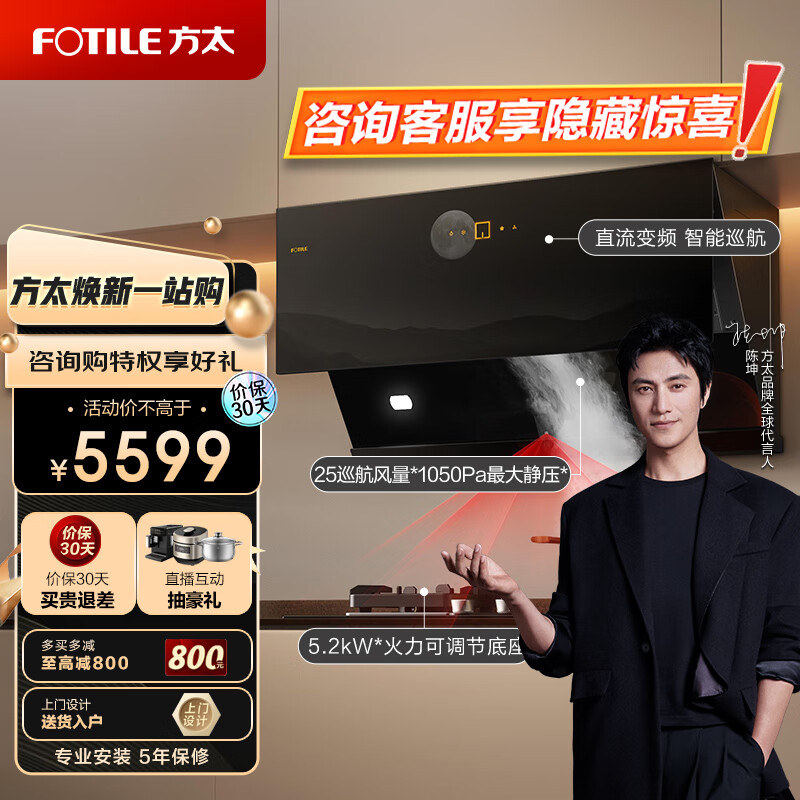 方太(FOTILE)抽吸油烟机灶具套装 侧吸式变频烟灶套装双智能巡航 25风量5.2kW猛火双灶JCD11T+02-TH27B天然气价格:5599.00元!