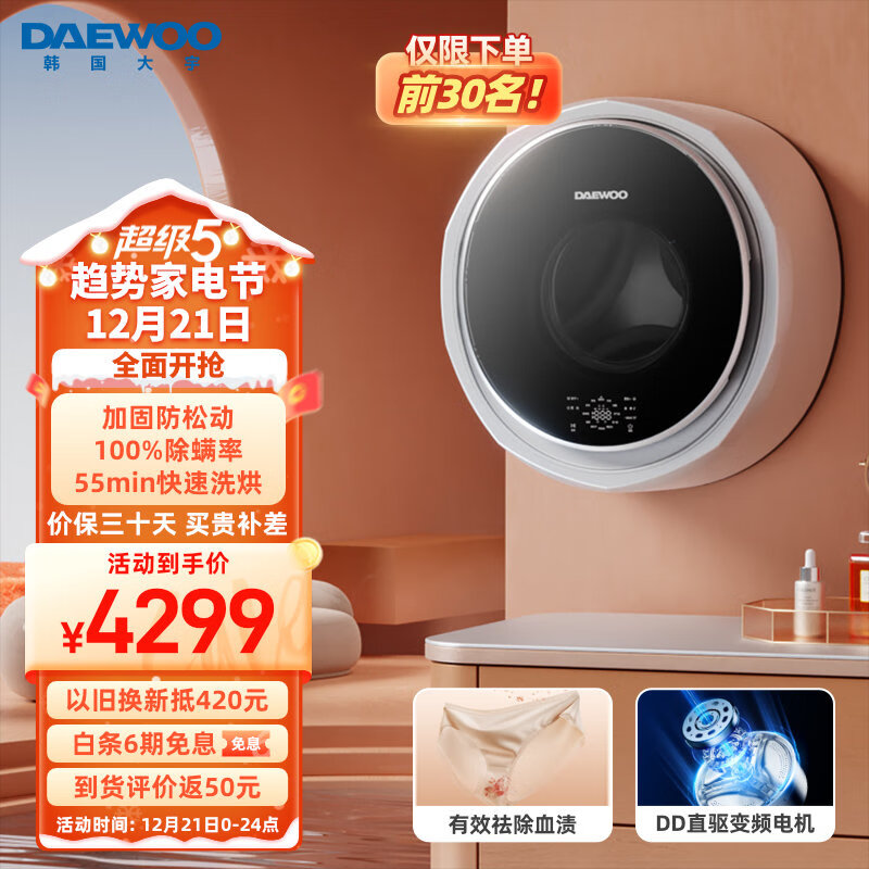 大宇(DAEWOO)3公斤壁挂洗衣机迷你滚筒洗衣机洗烘一体机全自动婴儿内衣洗衣机 dd直驱变频 DY-BGX05H 皎月白价格:4299.00元!