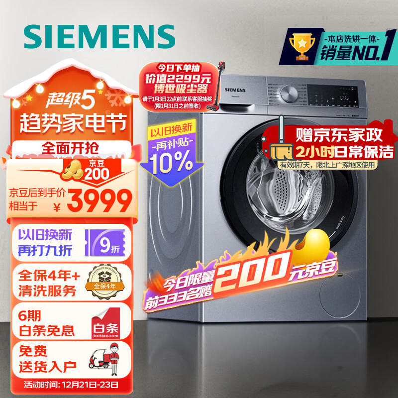 西门子(SIEMENS)10公斤滚筒全自动洗衣机烘干机一体机 低温净化除菌 热风清新 双重净筒智能烘干 X42W价格:4599.00元!