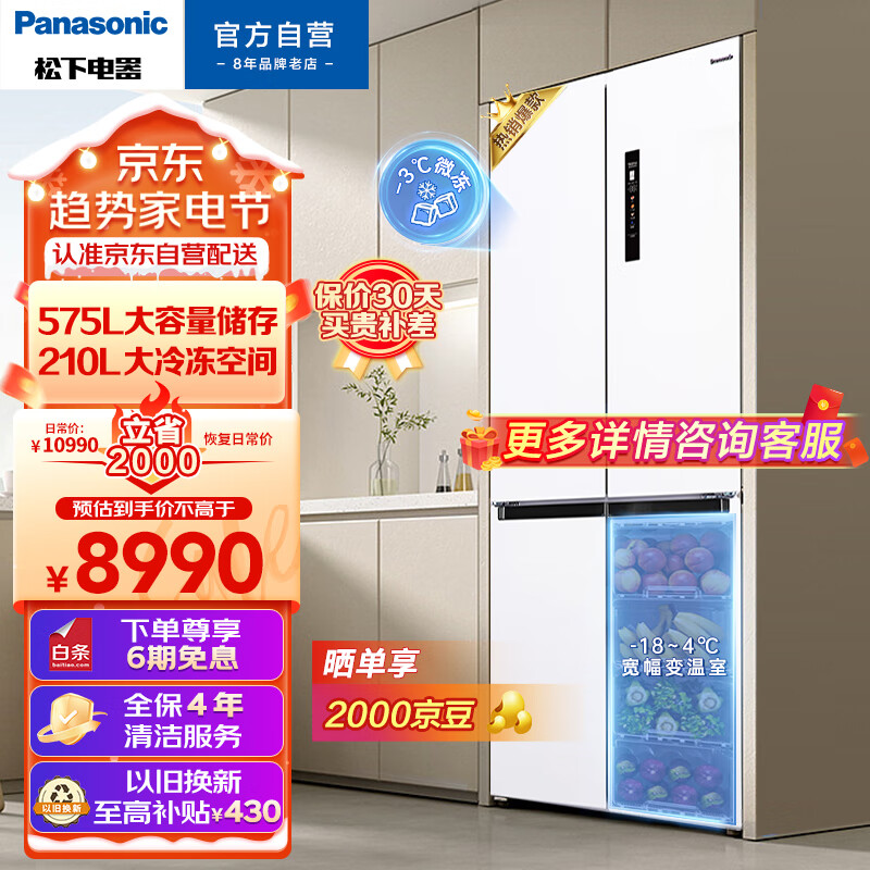 松下(Panasonic)大海豚575升十字对开门冰箱四开门 超薄嵌入式冰箱 干湿分储 一级能效 磨砂白色NR-JW58CMA-W价格:8990.00元!