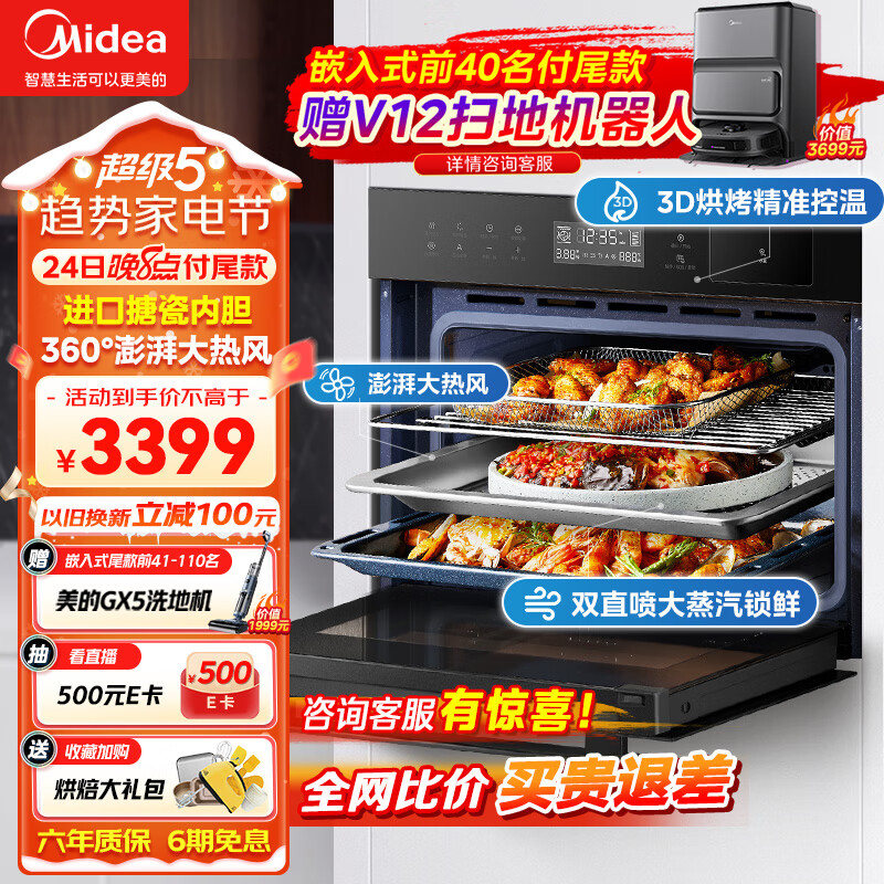 美的(Midea)嵌入式蒸烤一体机 家用多功能蒸箱烤箱空气炸三合一 京东小家APP操控 55L大容量搪瓷内胆BS5053W价格:3399.00元!