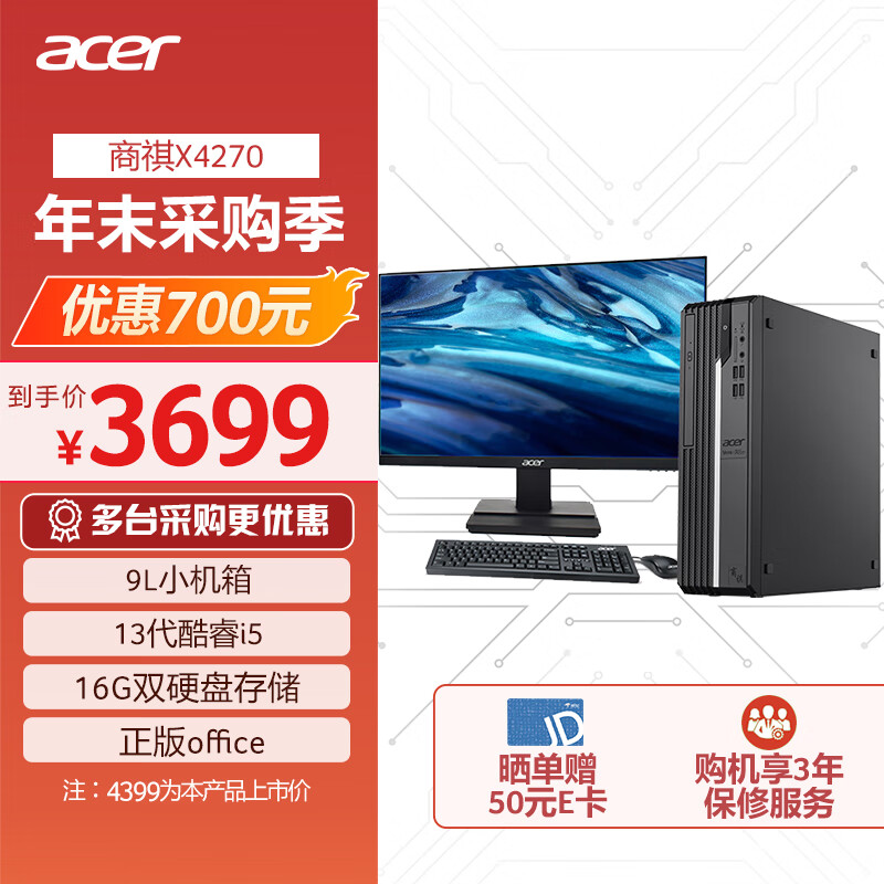 宏碁(Acer)· 未来商务台式机主机 商用办公电脑整机 (13代i5-13400 16G 512G+1T) 商祺X4270 681D 23.8英寸价格:3699.00元!