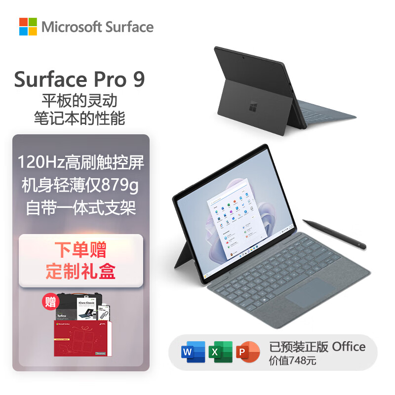 微软Surface Pro 9 石墨灰+冰晶蓝带触控笔键盘盖 i5 8G+256G 二合一平板电脑 13英寸120Hz触控屏 轻薄笔记本价格:8788.00元!