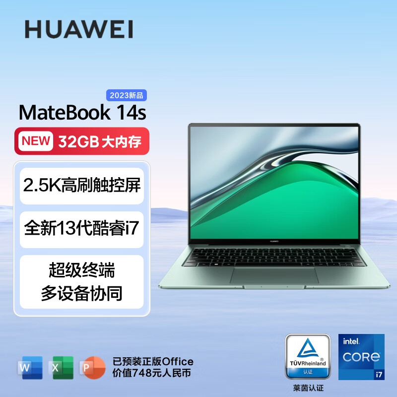 华为(HUAWEI)笔记本电脑MateBook 14s 2023 英特尔Evo 13代酷睿标压i7 32G 1T 14.2英寸120Hz触控/轻薄本/手机互联 云杉绿价格:8399.00元!