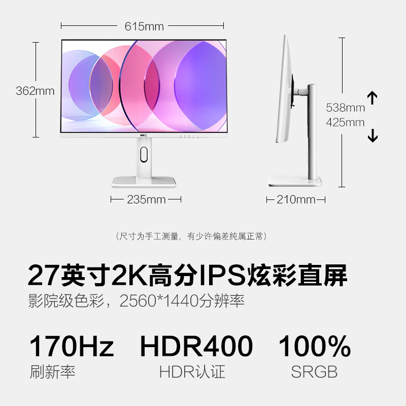 HKC 27英寸 2K 170HZ电竞显示屏 Fast IPS HDR400 1ms响应 旋转升降 电脑游戏 白色显示器 TG271Q价格:1799.00元!