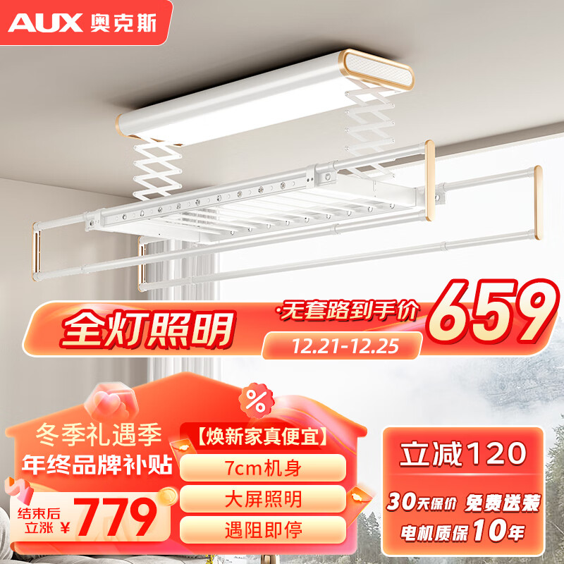 奥克斯(AUX)电动晾衣架升级款自动升降杆阳台室外四杆伸缩无线遥控LED照明白价格:739.00元!