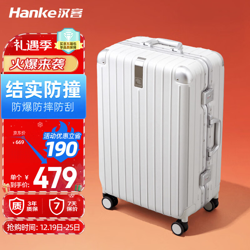 汉客行李箱铝框箱男拉杆箱女旅行箱大容量24英寸烟白色密码箱防爆耐摔价格:669.00元!