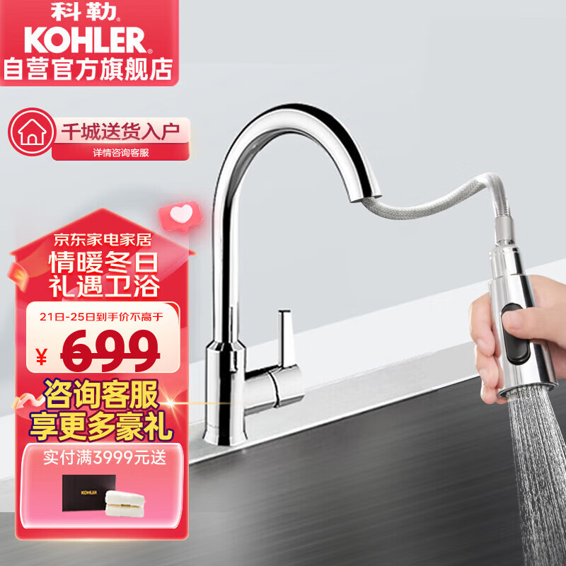 科勒(KOHLER)厨房龙头抽拉式水槽龙头洗碗厨盆冷热水龙头 防飞溅性价比款21366价格:779.00元!