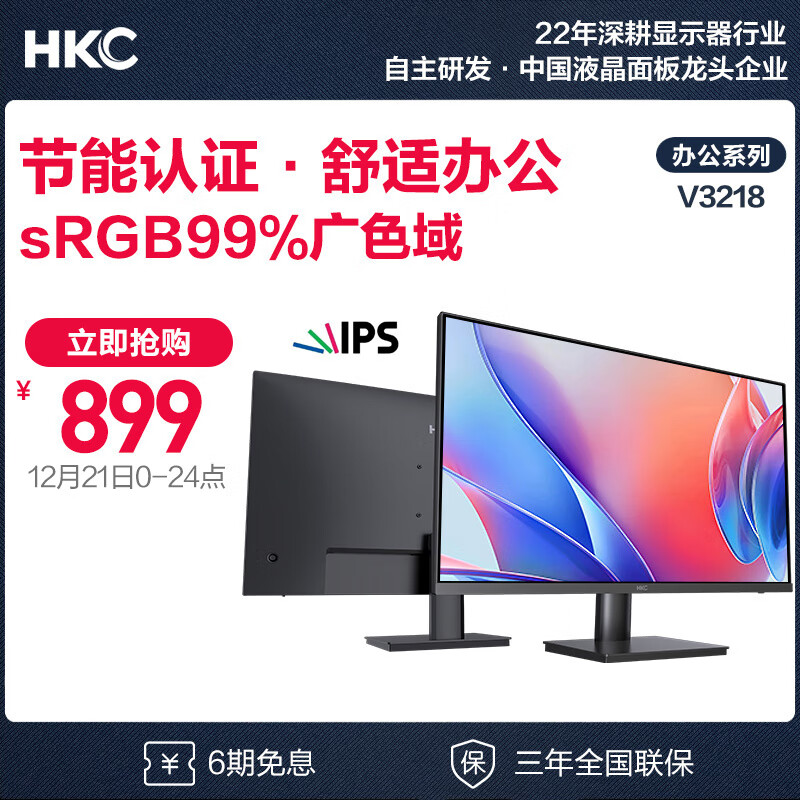HKC 31.5英寸 IPS屏 低蓝光不闪屏 广色域 三面微边 可壁挂 节能认证 商务办公台式电脑屏幕 显示器 V3218价格:999.00元!