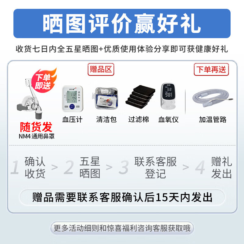 5、呼吸机在3个月前就放购物车了、就等5.31活动期间下单、果然有惊喜,使用了半个月来评价,戴上后不打呼,睡眠质量提高了很多,早买早享受!