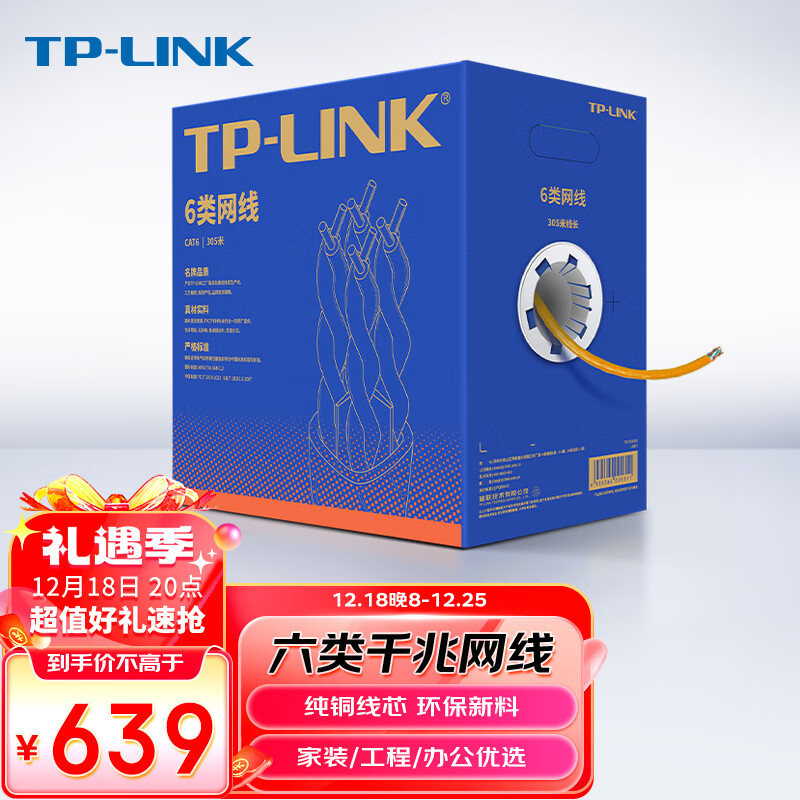 TP-link六类千兆网线 工程级无氧铜箱线305米 CAT6类非屏蔽纯铜双绞线 家装网络监控综合布线 EC6-305(橙)价格:639.00元!