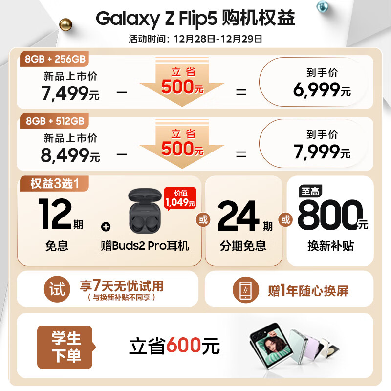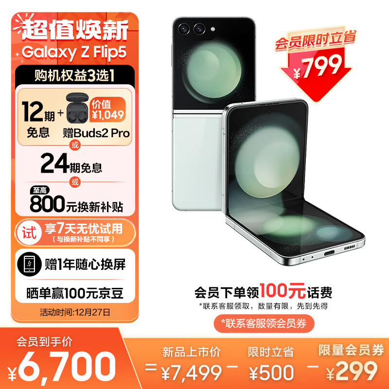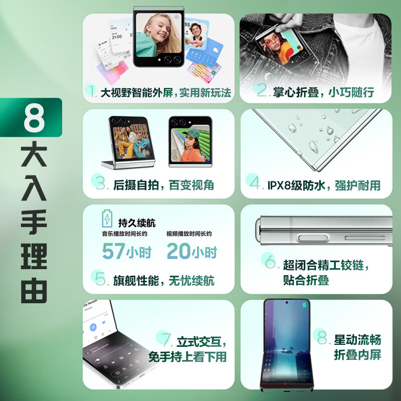 三星 SAMSUNG Galaxy Z Flip5 大视野外屏 掌心折叠 5G折叠手机 8GB+256GB 冰薄荷价格:7499.00元!