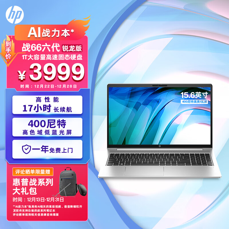 惠普(HP)战66 六代锐龙版15.6英寸轻薄笔记本电脑(2023锐龙R7-7730U 16G 1T 长续航 高色域低蓝光屏 AI新体验 高性能)价格:4099.00元!