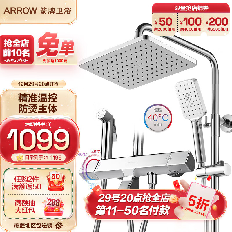 箭牌(ARROW)恒温花洒大顶喷洗浴洗澡淋浴喷头升降多功能喷枪莲蓬头 方形亮银恒温花洒3480SH-1价格:1509.00元!