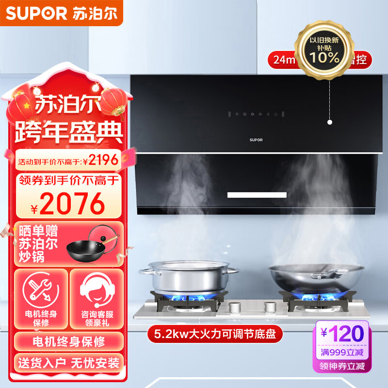 苏泊尔(SUPOR)抽油烟机燃气灶套装 24立方侧吸式烟灶套装 900Pa变频风压挥手智旋干洗吸油烟机DJ36+DS35天然气价格:2296.00元!