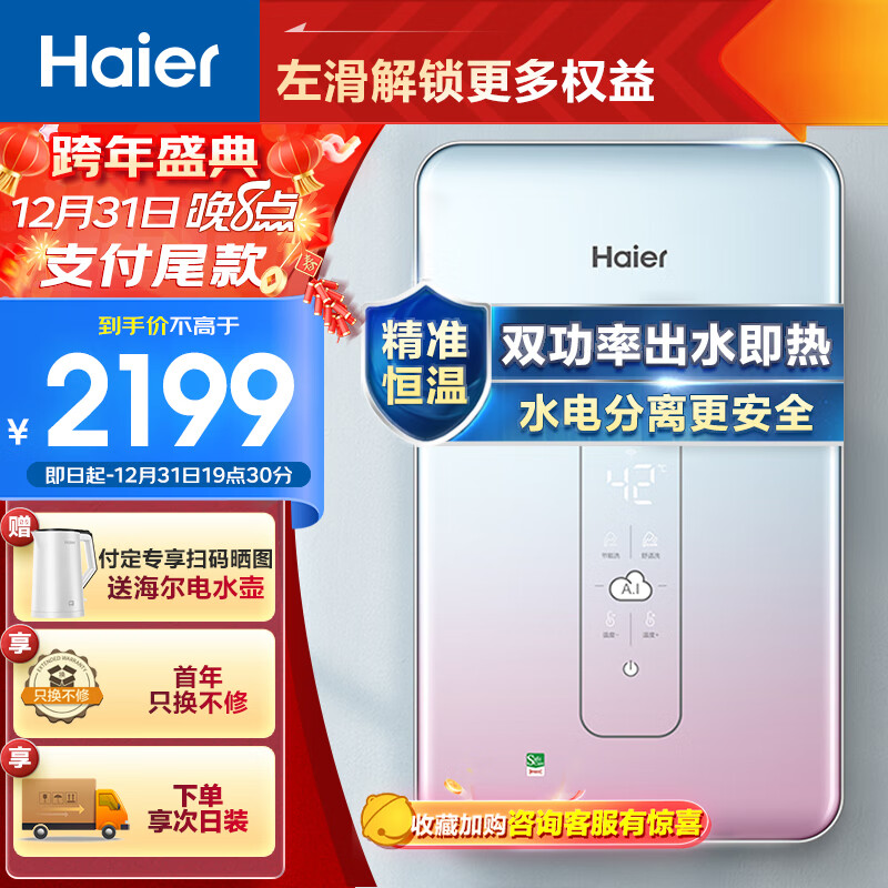 海尔(Haier)即热式电热水器电即热AI智能无感温差赠增压花洒家用 DSH--85AJ1新U1价格:2199.00元!
