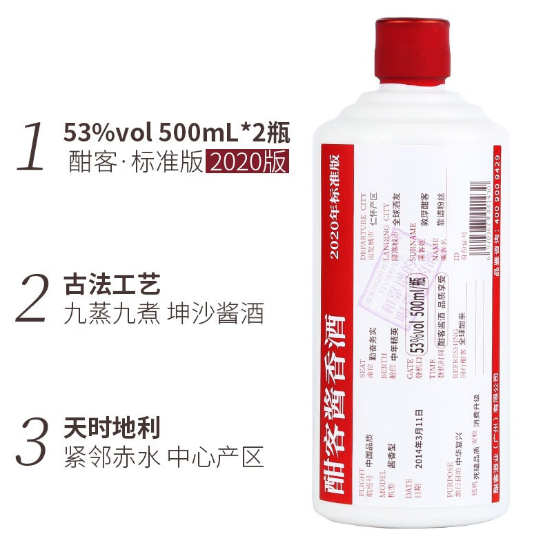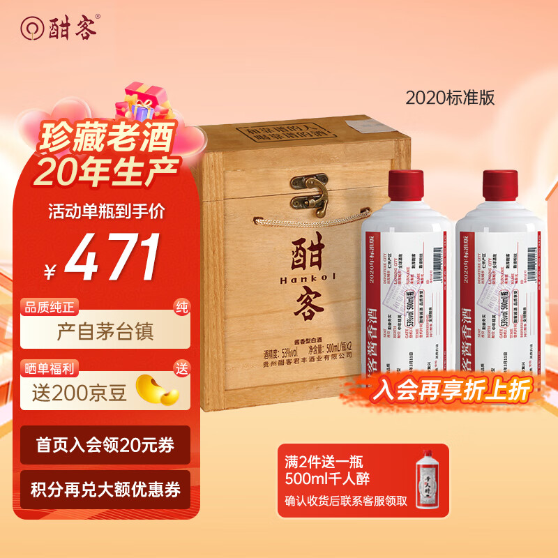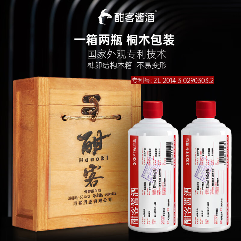 酣客 2020年标准版 酱香型白酒 53度坤沙大曲 500ml*2瓶 木箱礼盒装价格:1047.00元!