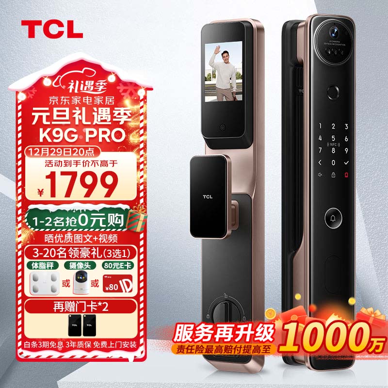 TCL灵速3D人脸识别大屏猫眼K9G Pro指纹锁智能密码锁全自动防盗门锁价格:2199.00元!