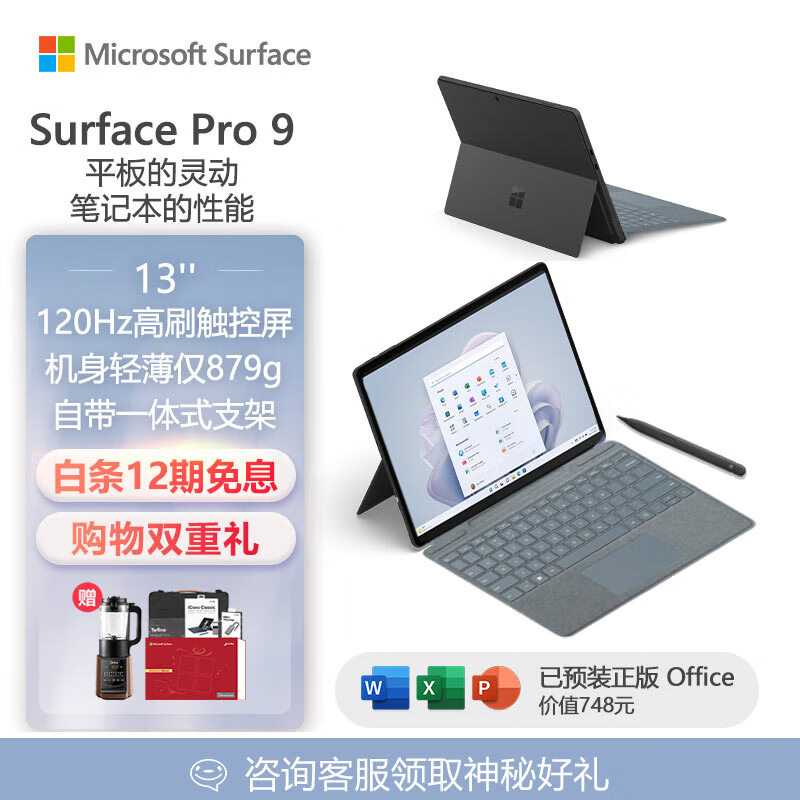 微软Surface Pro 9 石墨灰+冰晶蓝带触控笔键盘盖 i7 16G+256G 二合一学生平板 13英寸120Hz触控屏 笔记本价格:14488.00元!