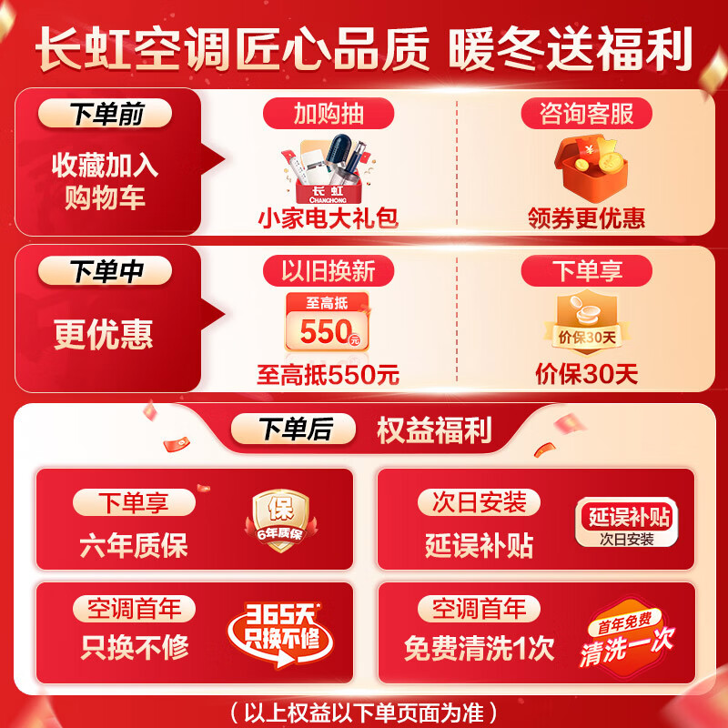 3、一直买的长虹空调很好用便宜这次双十一做活动更便宜了果断再入手一台餐厅用物流很快23号下单25号就到了安装师傅也很给力点个赞