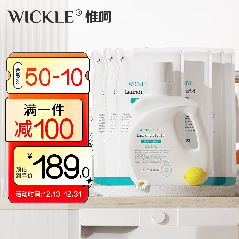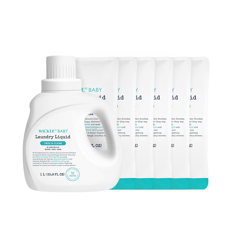 WICKLE婴儿洗衣液新生婴儿专用酵素洗衣液1瓶+6袋组合装 4L(自然香型)价格:289.00元!