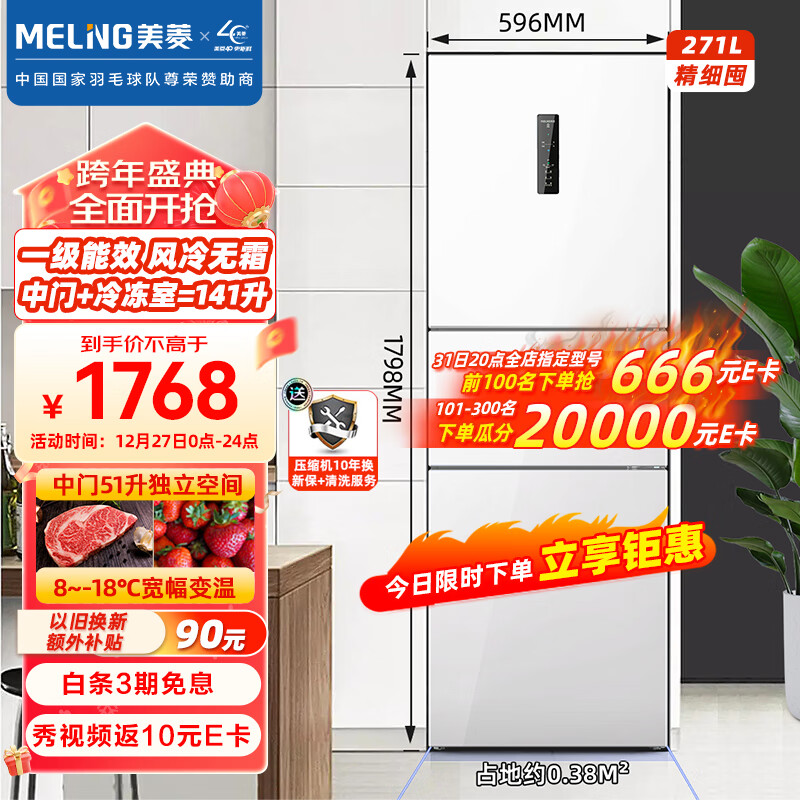美菱(MeiLing)【离子净】271升三门家用冰箱变频一级风冷无霜低噪租房宿舍白色小型冰箱BCD-271WP3CX以旧换新价格:1768.00元!