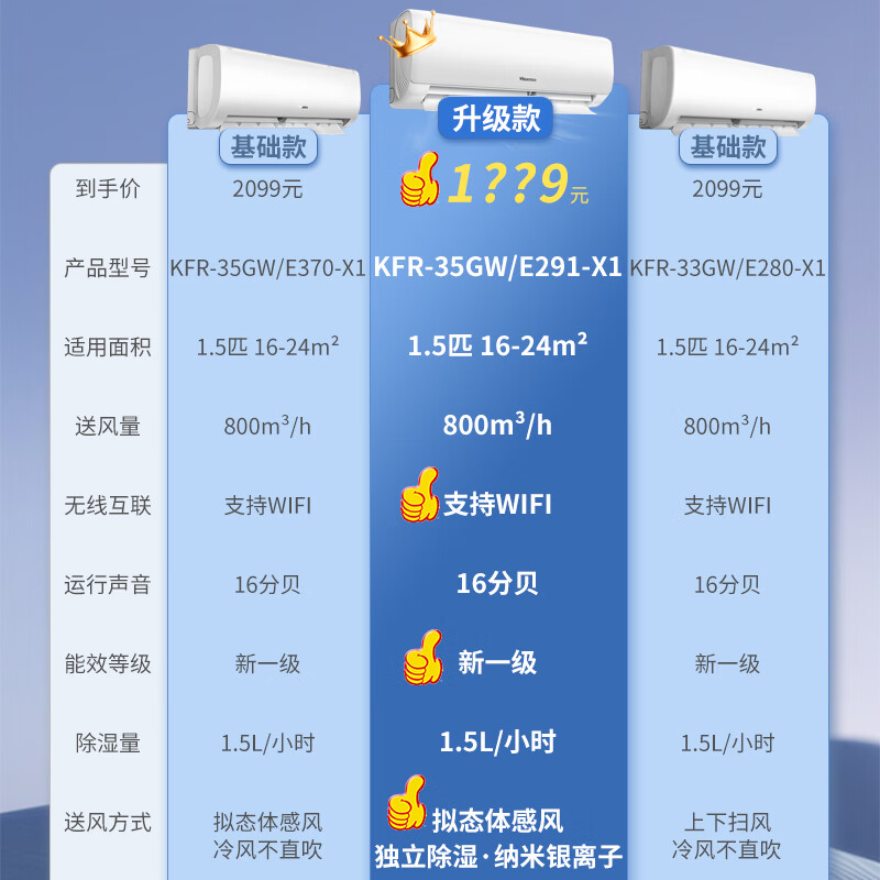 海信空调1.5匹挂机变频大风量速冷暖WIFI智能壁挂式卧室空调新一级能效KFR-35GW/E291-X1以旧换新价格:2199.00元!