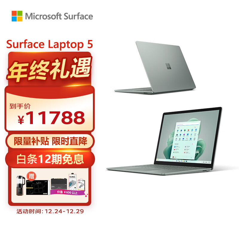 微软Surface Laptop 5 学生笔记本电脑 i5 16G+512G 仙茶绿 Evo认证13.5英寸2.2K高色域触控屏价格:11788.00元!