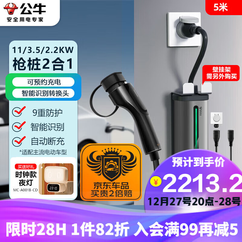 公牛(BULL)便携式充电桩充电枪随车充适用比亚迪极氪等3.5/11KW枪桩2合1固定便携两用 5M价格:2699.00元!