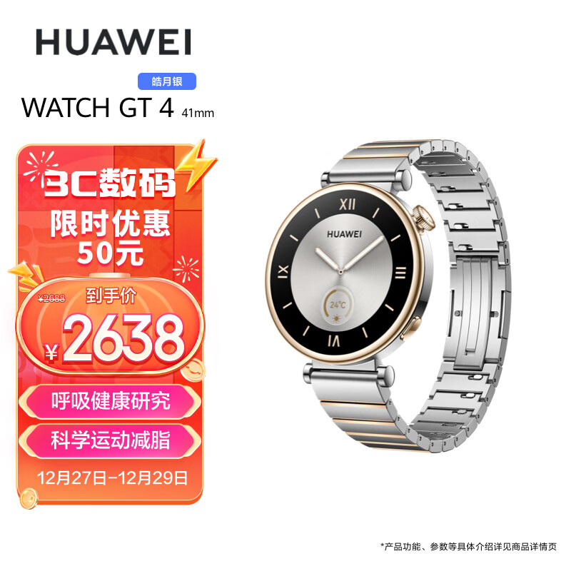 华为 HUAWEI WATCH GT 4 不锈钢间金表带 41mm 皓月银华为智能手表价格:2638.00元!