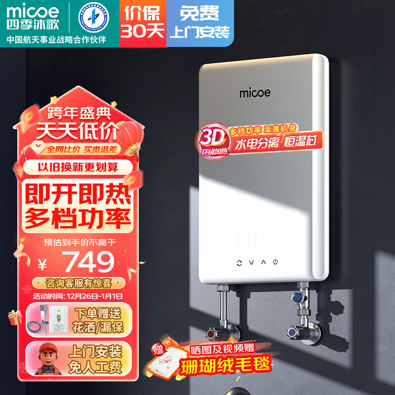 四季沐歌(MICOE)电热水器即热式 家用洗澡淋浴恒温免储水扁桶超薄过水热变频智能机 上门安装 DSK-H85-MS03【8500W变频】价格:899.00元!