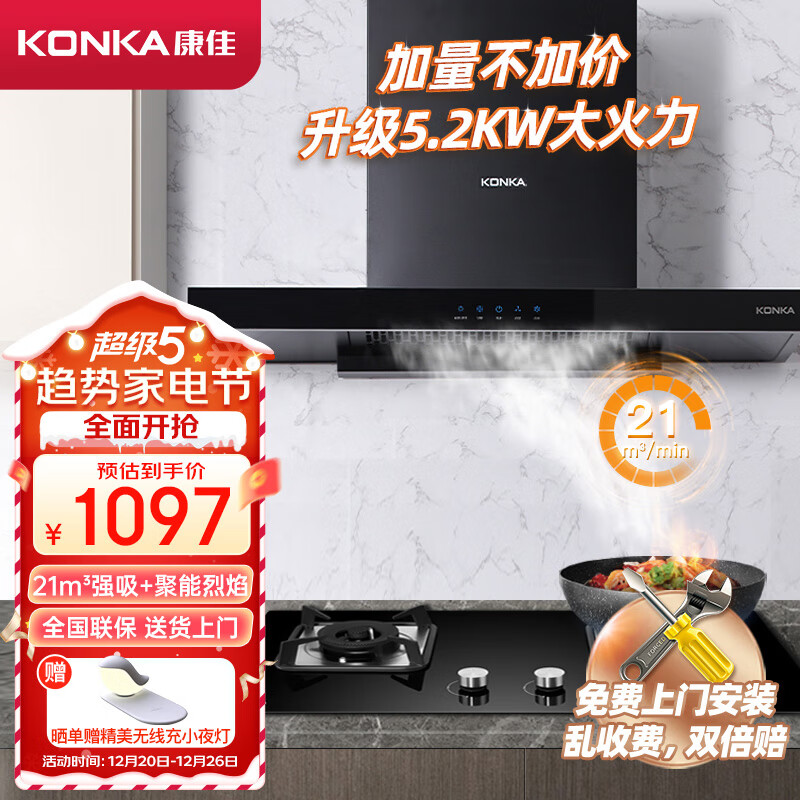 康佳(KONKA)抽油烟机燃气灶具套装 家用欧式21m3/min大吸力挥手自清洗烟灶两件套装 KT55+B500F(天然气)价格:1097.00元!