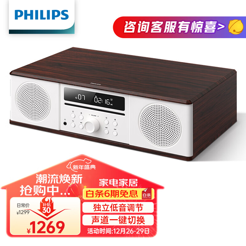 飞利浦(PHILIPS)CD机桌面音响CD播放机迷你音响CD播放器家庭台式音响音箱收音机木质蓝牙M5008价格:1269.00元!
