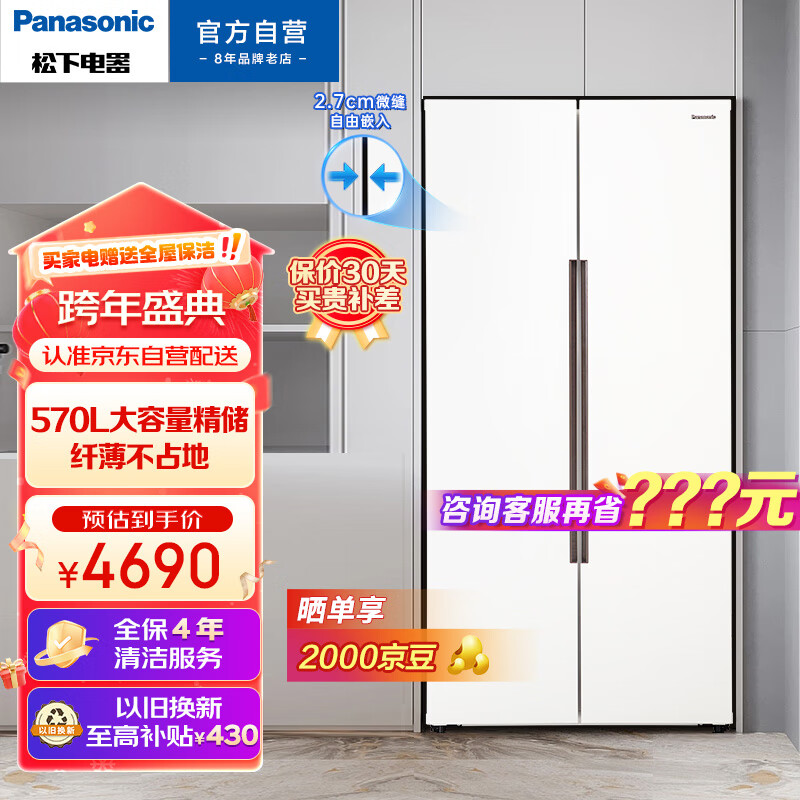 松下(Panasonic)570升家用对开门冰箱 自由嵌入式 超薄大容量双开门 冷冻王冰箱 磨砂白色NR-JB57WPA-W价格:4690.00元!
