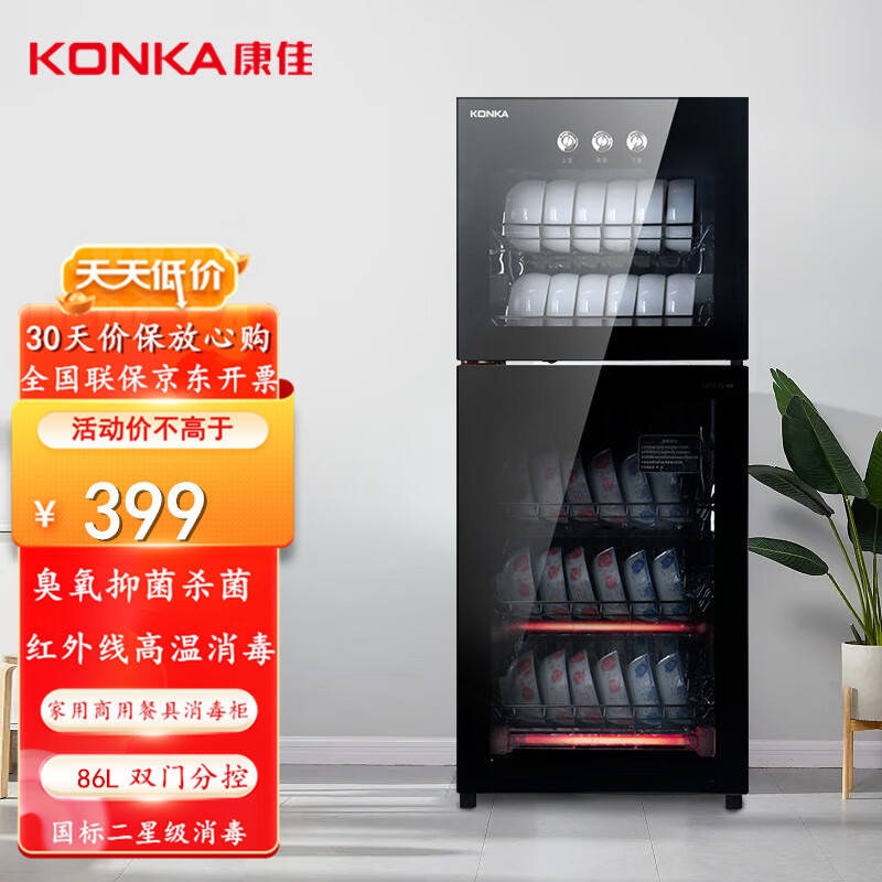 康佳(KONKA)商用消毒柜家用消毒碗柜立式臭氧杀菌红外线高温大容量86L双门ZTP168K23价格:429.00元!
