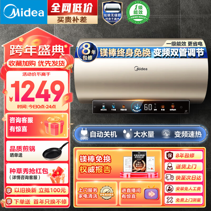 美的(Midea)终身免换镁棒60升电热水器家用储水式3300W/2300W速热变频省电一级能效低耗节能F6033-JE6(HE)价格:1449.00元!