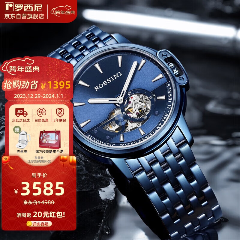 罗西尼(ROSSINI)手表男机械表勋章蓝盘钢带礼物送男友国表镂空商务蓝 6793价格:4105.00元!