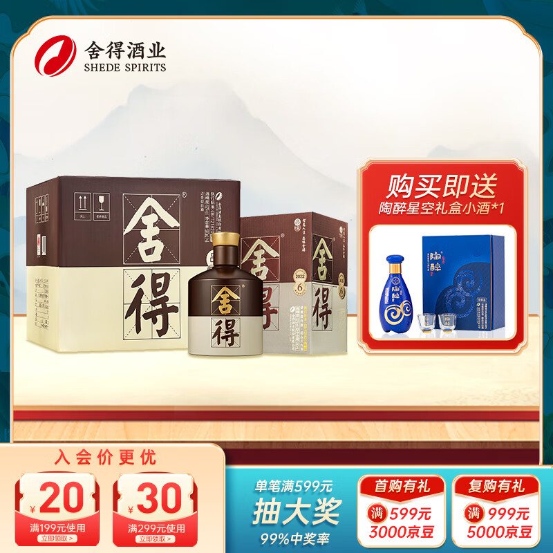 5、一次买了三盒,凑够一箱。盒里的酒杯有点low,就不拍了,能凑合用。活动买的,t68价格合适,合适的口粮。包装设计:包装只能说挺实用,随送品味舍得才是我看中的,可以一窥舍得地理标酒水产品~