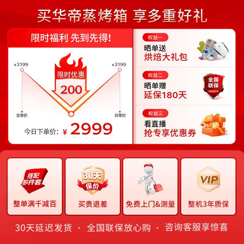 4、抢到手了,50升大容量,够用。蒸箱很重,用料扎实。昨天也空烤了_下,去去味,还没正式启用。期待华帝好品质。