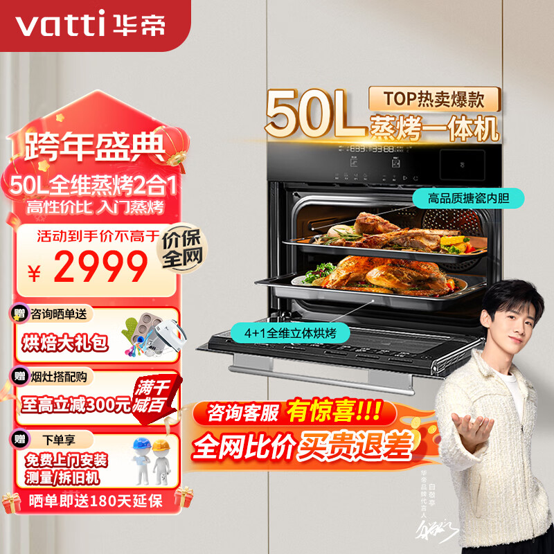 华帝(VATTI)蒸烤箱一体机嵌入式 蒸箱烤箱家用 50L大容量 4+1全维烘烤 搪瓷内胆 JYQ50-i23018价格:3199.00元!