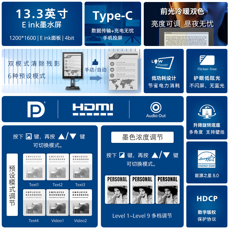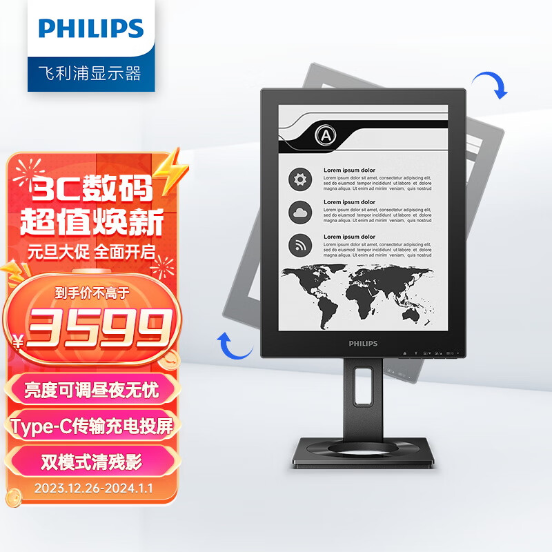飞利浦(PHILIPS)13.3英寸 电子墨水屏 办公显示器 电纸书 Type-C 旋转支架 电子书阅读器13B1K3300价格:3599.00元!