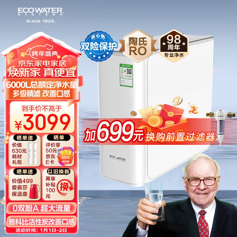 怡口净水(ECOWATER)净水器家用600G厨下母婴直饮长效陶氏膜RO反渗透自动冲洗无双酚A无添加剂1级水效水晶系列ERO150-3价格:3399.00元!