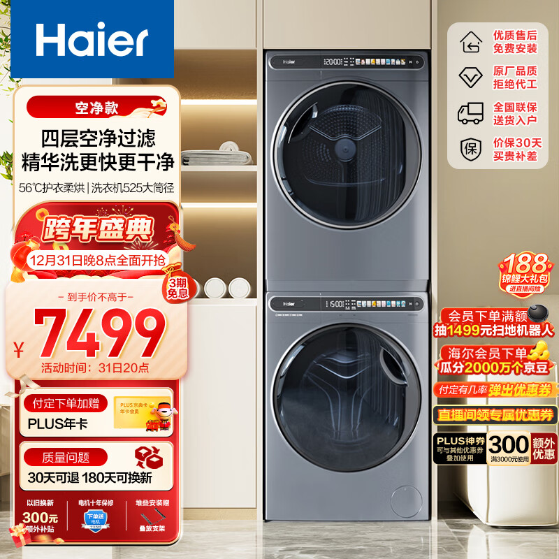 海尔(Haier)精华洗洗烘套装 10kg超薄大筒径滚筒洗衣机+空净过滤热泵烘干机家用 EG100MATESL59S+59组合价格:7499.00元!