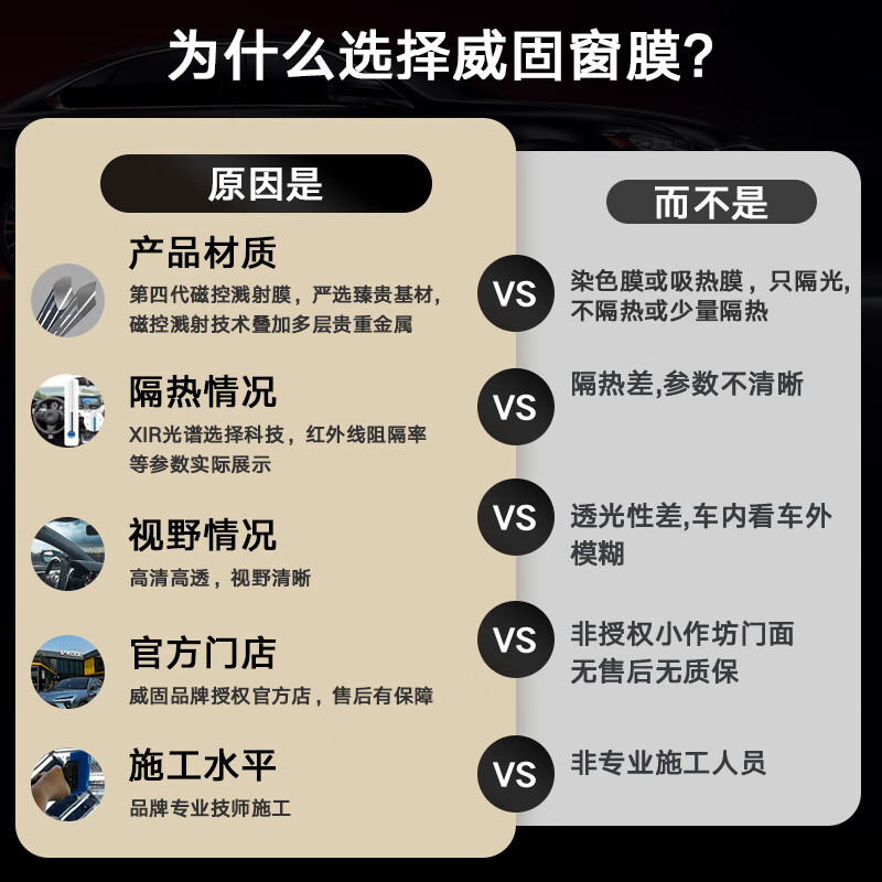 1、威固的车窗膜品质是肉眼可见的好,一分钱一分货。车膜施工速度也非常快,车子开到店里,放心交给师傅贴,店里也管洗车,自己去办别的事就行了。贴完隔热不错,隐私性也非常好,。膜有质保,可以放心购买,要隔热,选威固不会错的