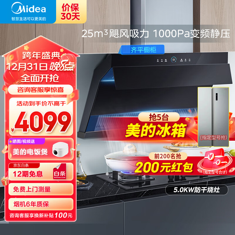 美的(Midea)抽油烟机灶具套装 顶侧双吸油烟机家用25风量变频巡航超薄双吸烟灶套装AC7+Q36S液化气套装价格:4099.00元!