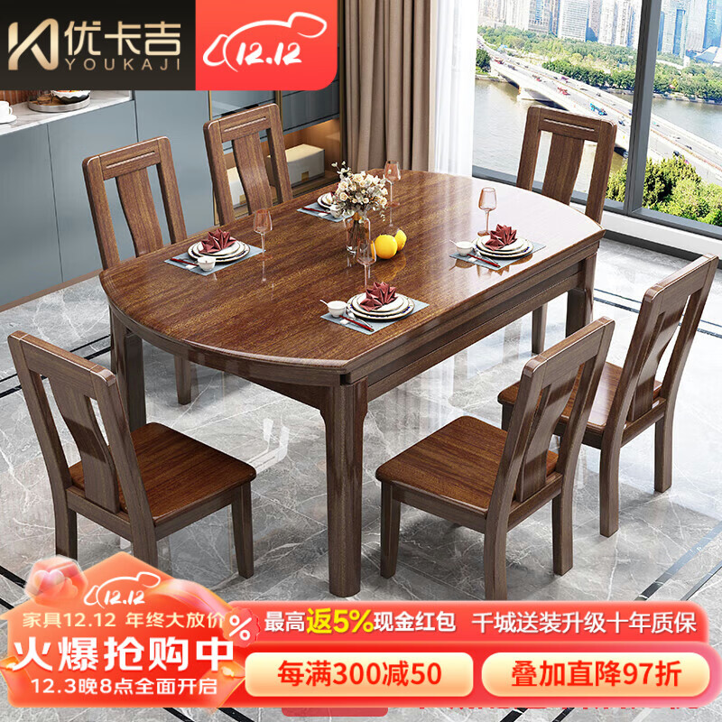 优卡吉胡桃木实木餐桌椅可伸缩方圆两用饭桌MW-1001# 1.35米餐桌+6椅价格:3989.00元!